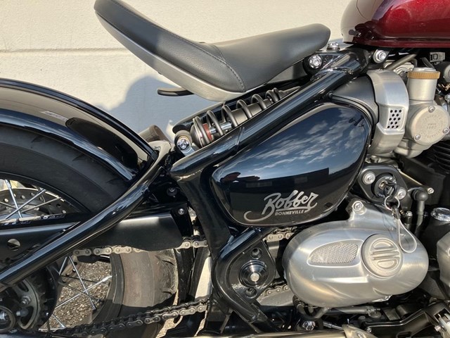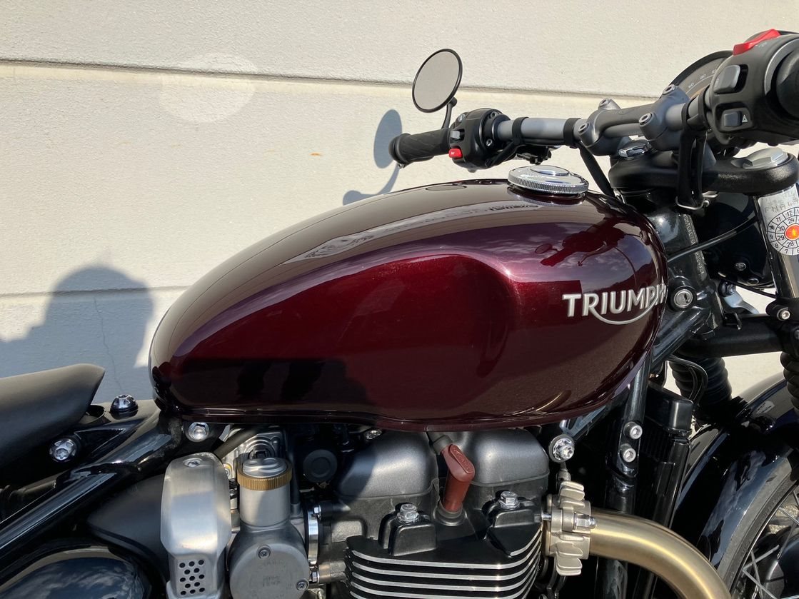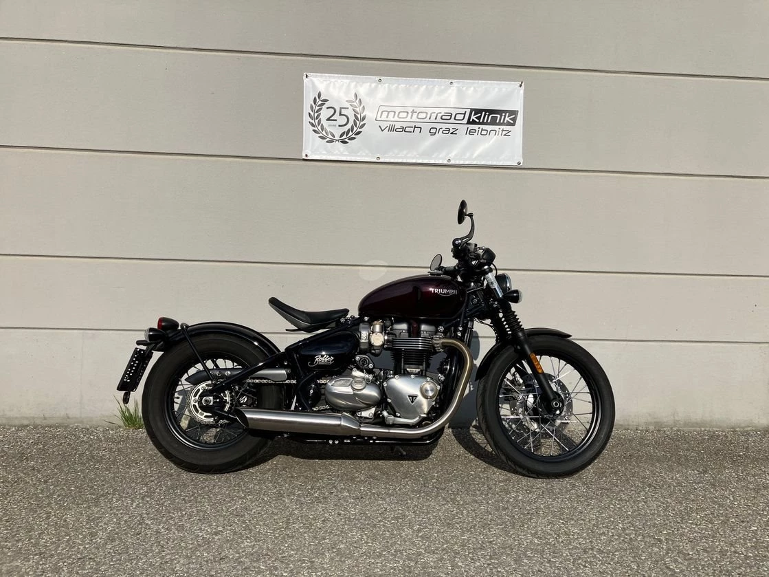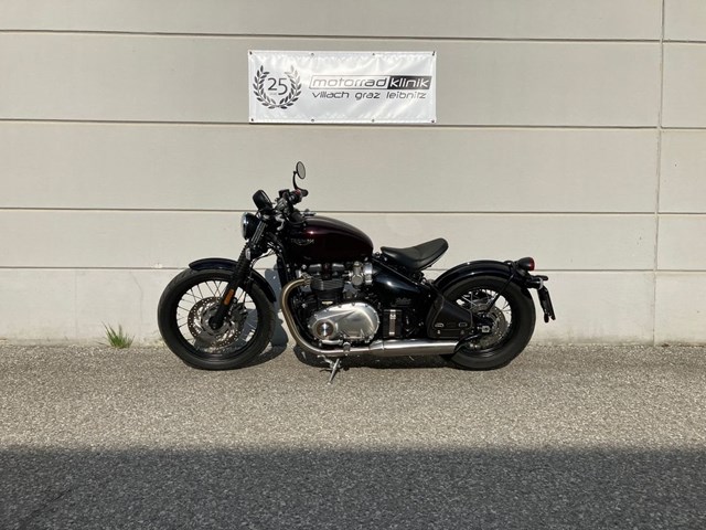 Schöne Triumph Bonneville Bobber in Morello Red aus Erstbesitz mit wenig Kilometer inkl. kleine Seitentasche links.