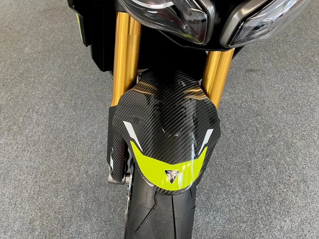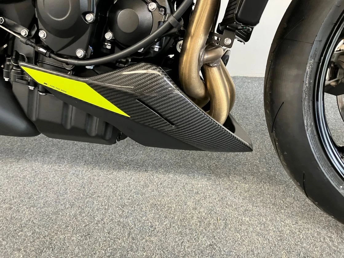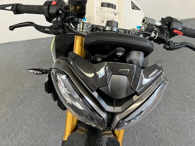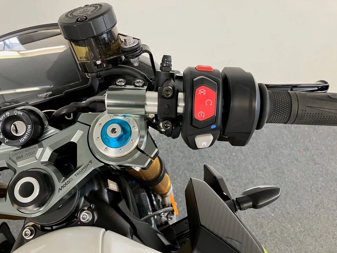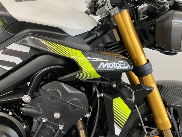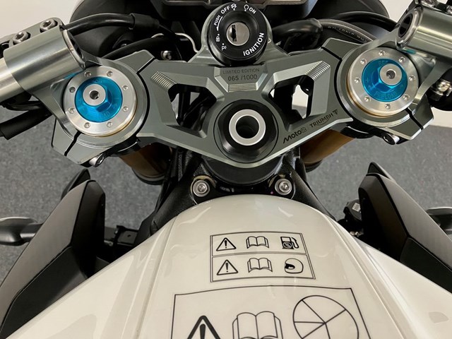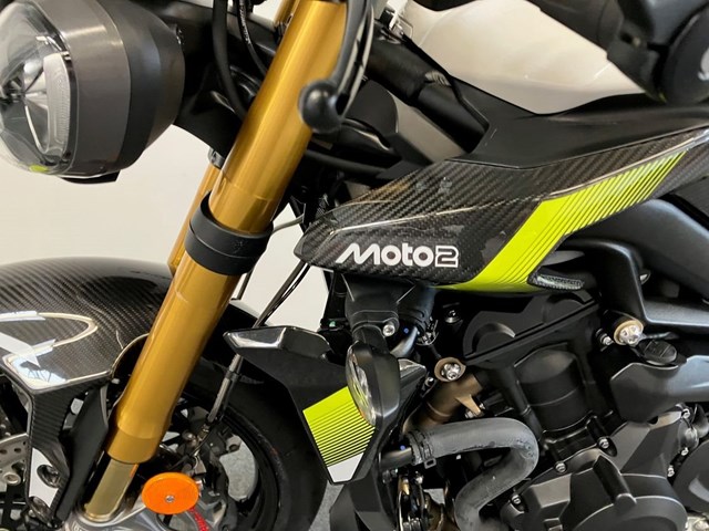 Auf 1.000 Einheiten limitierte Street Triple Moto2 Edition bringt Racing-Technik und Exklusivität zusammen.Sichtbare Carbonteile an Seitendeckeln, Bugspoiler und Kotflügel. Die Gabelbrücke wird aus dem Vollen gefräst, trägt eine individuelle Seriennummer und das Moto2-Logo. Auch im 5-Zoll-TFT-Display erscheint beim Start das Moto2-Branding.